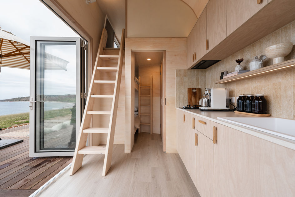 Nora sleeps up-to 4 people with one loft queen bed and one slim size bunk bed. This tiny house is adults only due to the unique features of the property. Nora is Sol Hus' only pet-friendly tiny house.